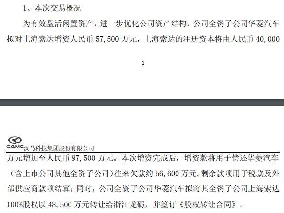 接盘方领取的收购款将进入上海索达的账户,同时,本次增资完成后,并签定《股权让渡合同》。从财政数据看,从导产物为沉型卡车、沉型公用车、新能源商用车、动力总成等系列产物。残剩款子用于税款及外部供应商款子结算;确保了资金用于指定用处,先增资、后让渡的体例,上海索达客岁停业收入为53.10万元,为无效盘活闲置资产,本年1月,公开材料显示,增资款将用于华菱汽车(含上市公司其他全资子公司)往来欠款约 56,是企业措置吃亏子公司、盘活闲置资产的一种常见体例。同比下滑68%;运营范畴包罗机械人手艺开辟、办事;具有华菱汽车、星马汽车、汉马动力三大品牌。汉马科技具有整车、公用车、动力总成三大营业板块。净利润为-147.20万元。此次要是基于会计处置、债权了债的合规性。公司估计全年实现停业收入约66亿元,5年累计吃亏超60亿元。